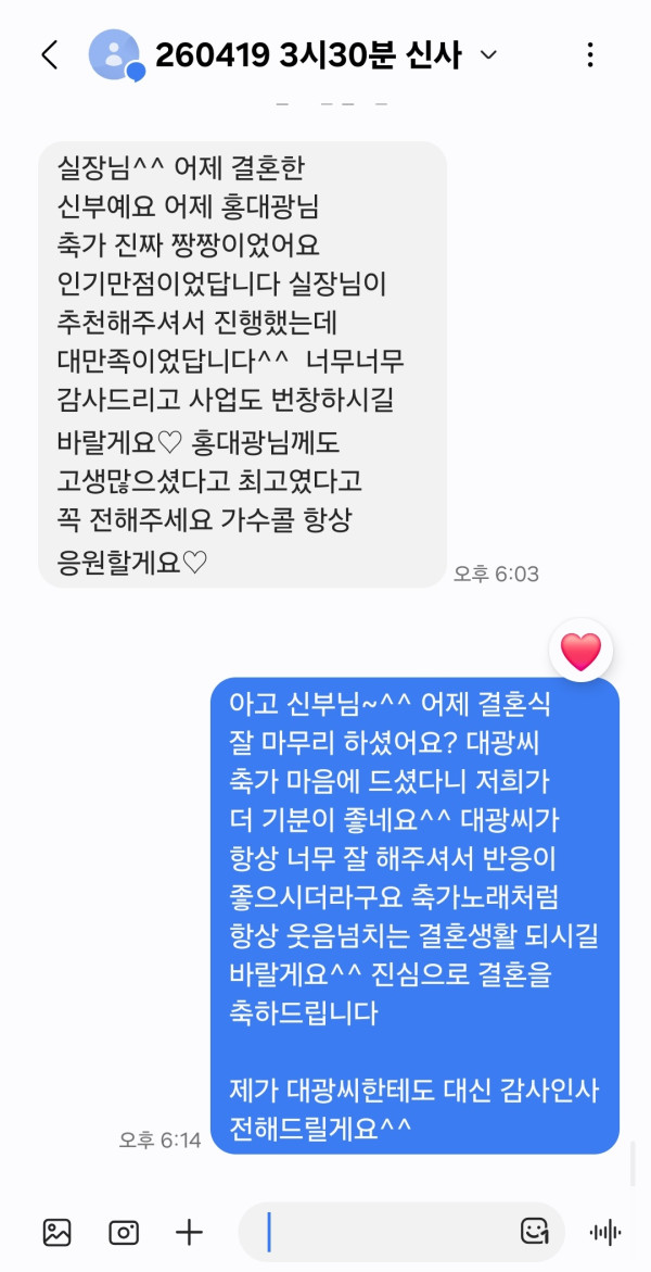 신부님께서 축가 최고였다고 이렇게 감사의 연락을 주셨어요^^
