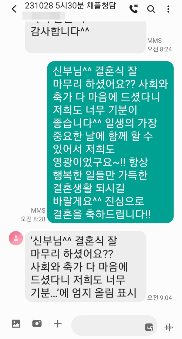 신부님께서 사회와 축가 다 너무 마음에 들었다고 이렇게 감사연락을 주셨어요^^