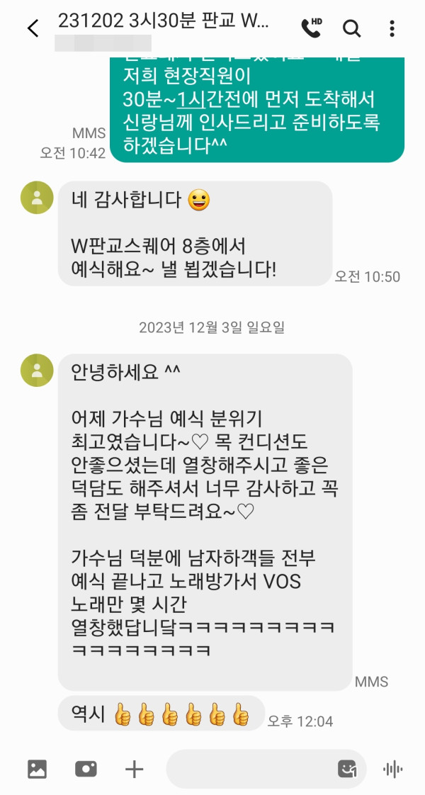 신랑신부님 그리고 하객들 모두 축가 너무 마음에 들었다고 감사하다고 이렇게 연락을 주셨는데요