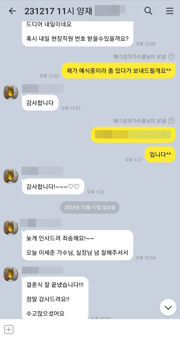 신랑님께서 축가 너무 신경 많이 써주셔서 감사하다고 이렇게 연락을 주셨어요~!!
