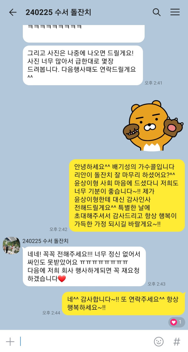 소중한 아이의 첫번째 생일때 초대해주셔서 감사드리고 항상 행복한 가정되시길 바랄게요^^