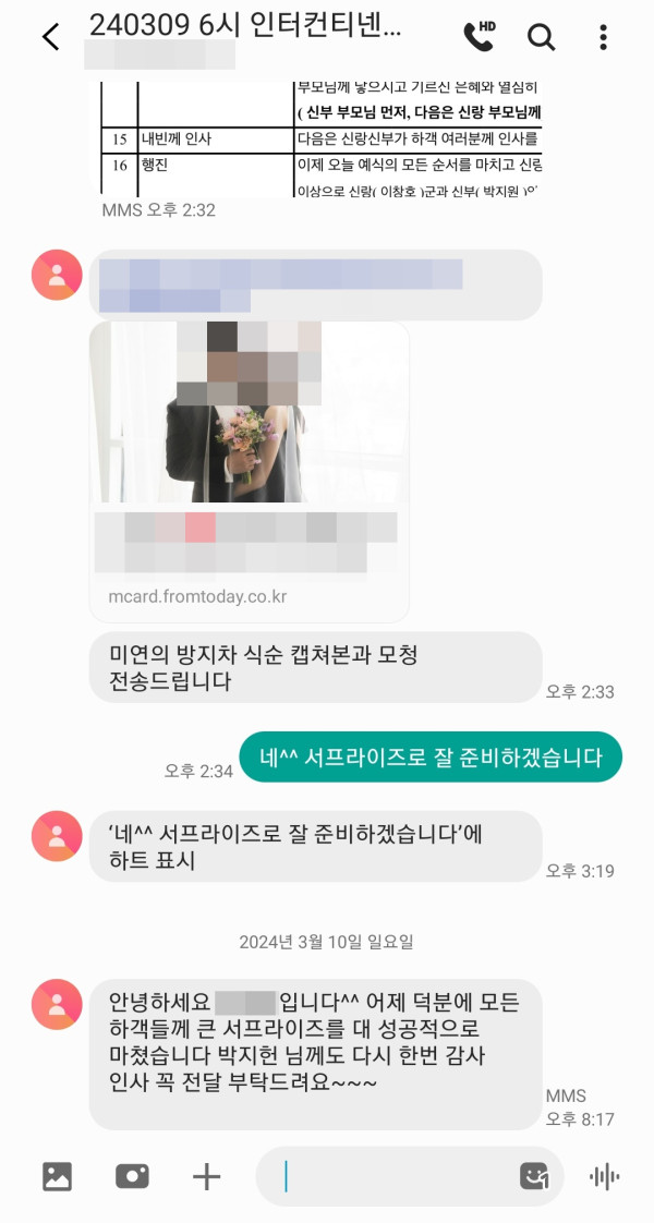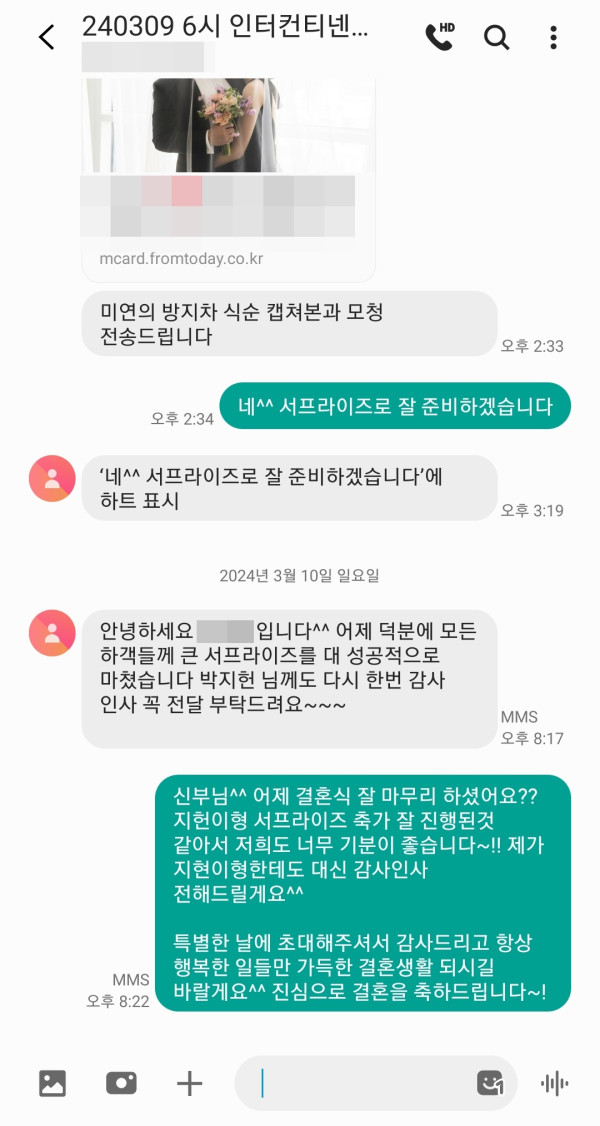 서프라이즈로 너무 잘 진행됐다고 감사하다고 이렇게 연락을 주셨어요^^