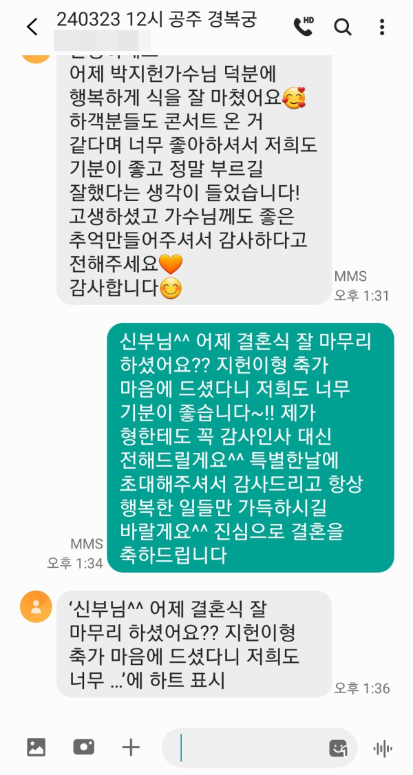 신부님께서 축가 너무 잘해주셔서 다들 너무 좋아했다고 감사하다고 이렇게 연락을 주셨어요~!!