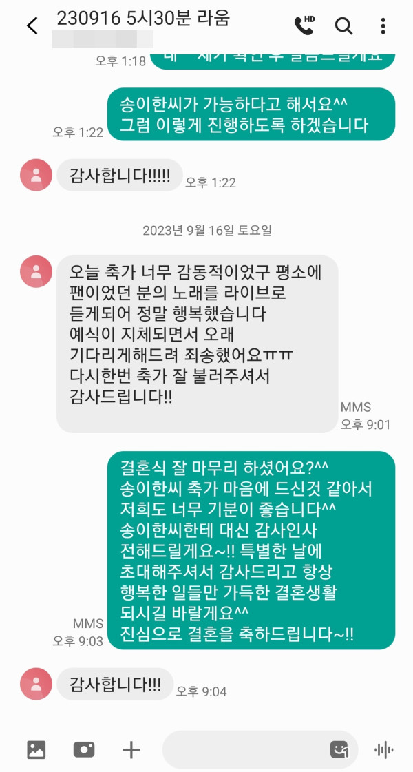 9월 16일 가수 송이한 결혼식축가 후기입니다^^