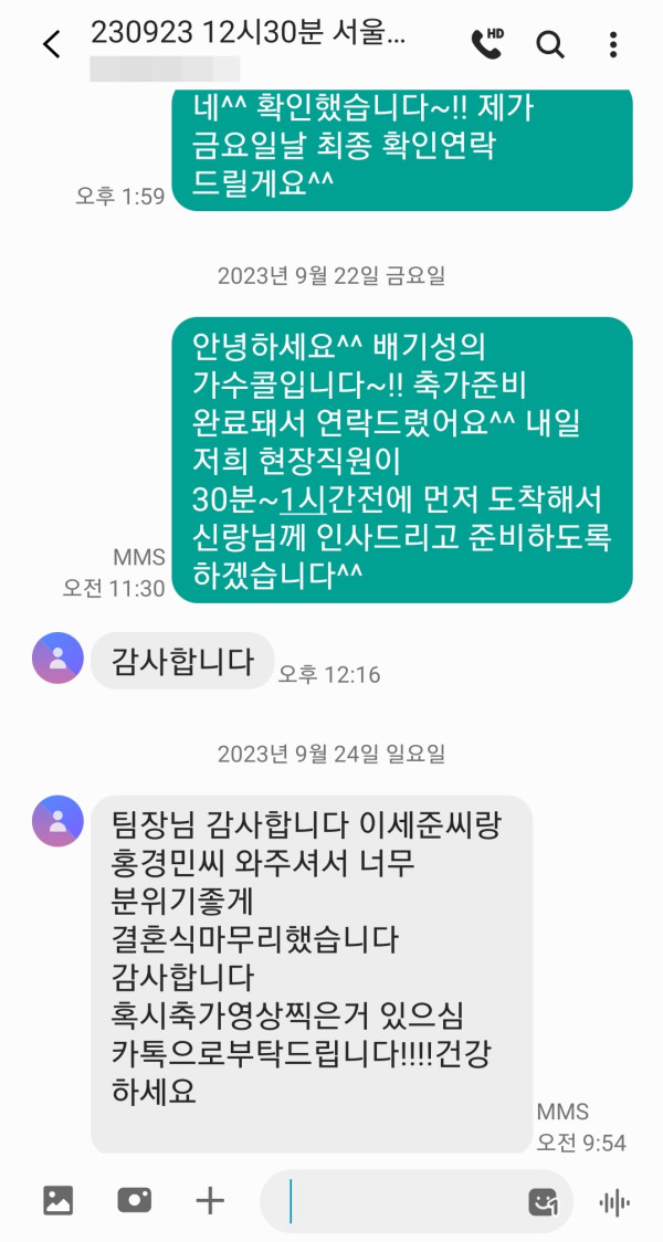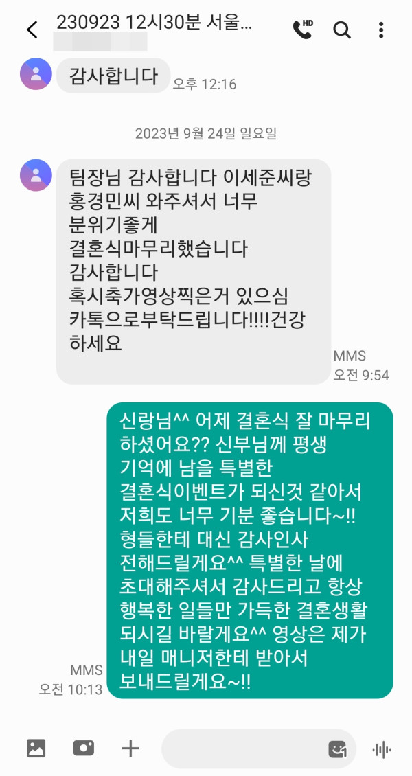 신랑님께서 너무 좋으셨다고 이렇게 감사연락을 주셨는데요~!!
