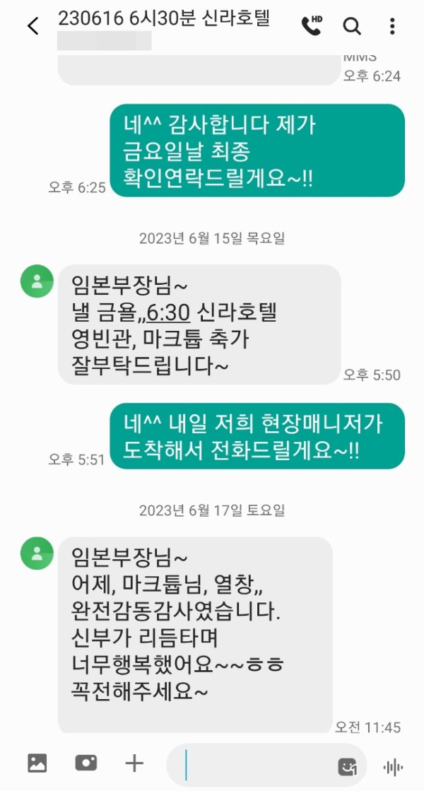 신랑신부님 두분 다 너무 만족해하셨다고 이렇게 감사연락을 주셨어요^^