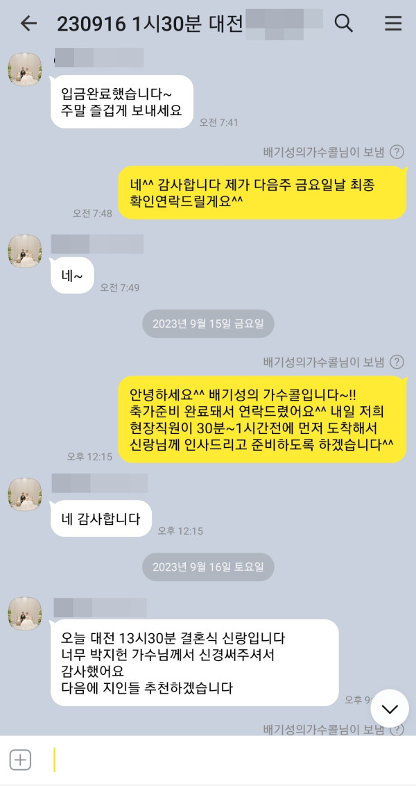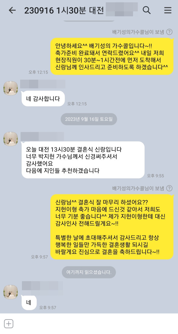 신랑님께서 축가 너무 좋으셨다고 감사하다고 연락을 주셨는데요