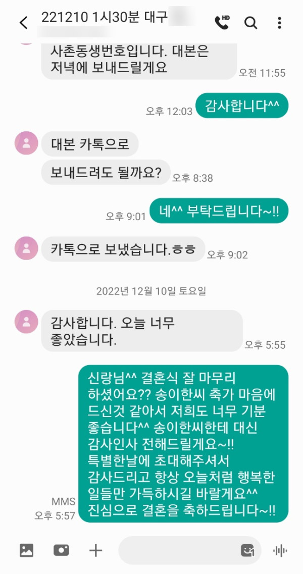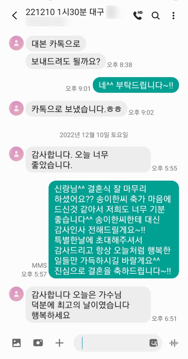 신랑님께서 축가 너무 좋았다고 송이한씨 덕분에 결혼식이 더 빛났다고 연락을 주셨어요^^