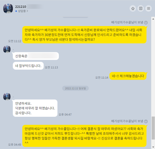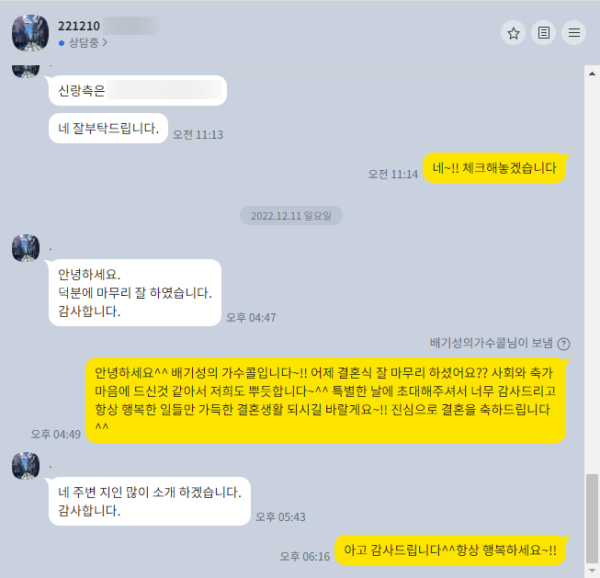 사회와 축가 마음에 드신것 같아서 저희도 너무 기분이 좋고 특별한 날에 초대해주셔서 너무 감사드립니다