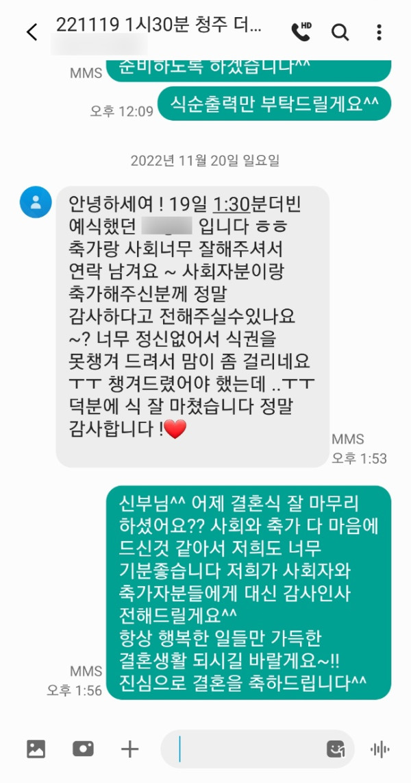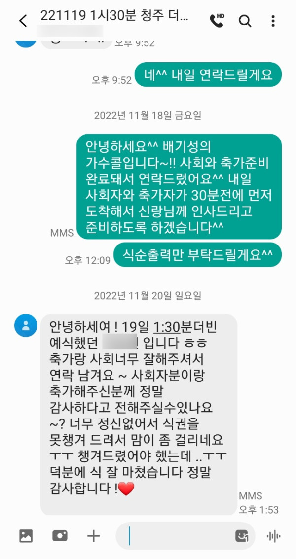 11월 19일 전문사회자+전문축가자 결혼식사회 축가 후기입니다^^