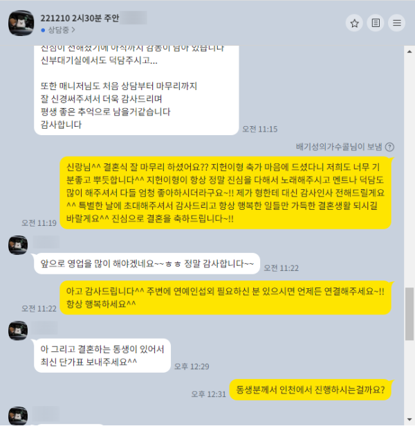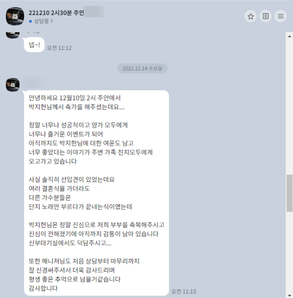 박지헌씨 축가뿐만 아니라 멘트까지 너무 진심을 담아 잘해주셔서 감사드린다고 이렇게 연락을 주셨어요^^