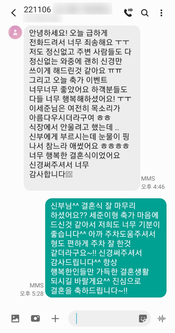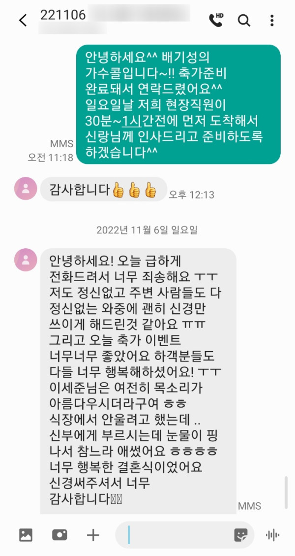 신부님께서 축가 너무 좋았다고 하객분들에게도 이벤트가 잘 된것 같다고 이렇게 감사연락을 주셨어요^^
