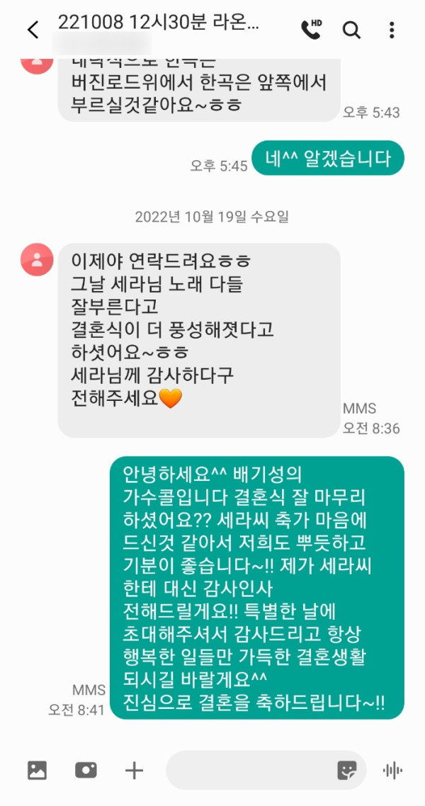 지난 10월 8일 라온제나 강남에서 진행된 가수 제이세라 결혼식축가 후기입니다^^