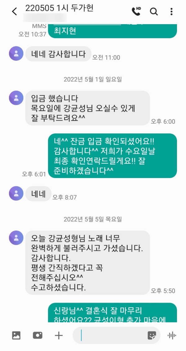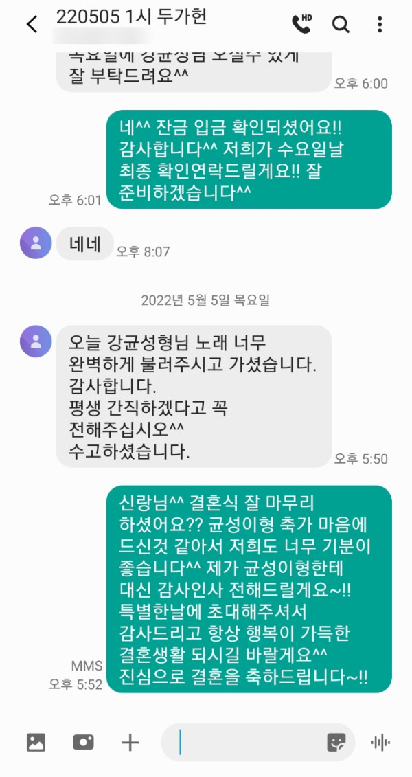 신랑님께서 축가 너무 완벽했다고 너무 감사드린다고 이렇게