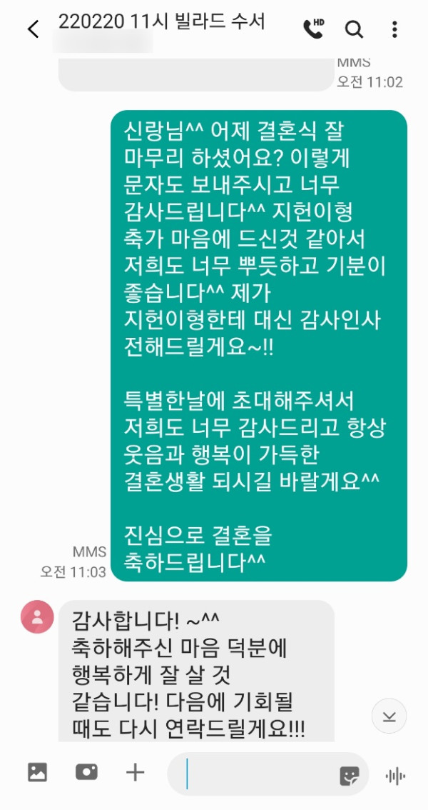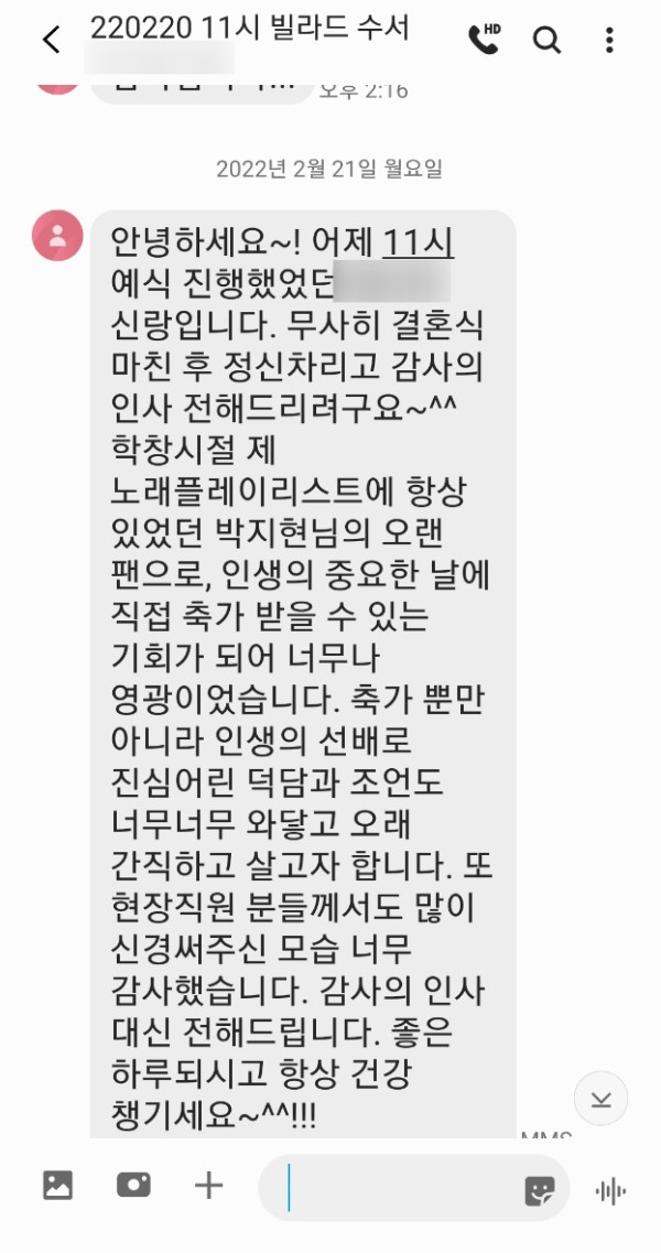 신랑님께서 축가 너무 기억에 남고 너무 감사드린다고