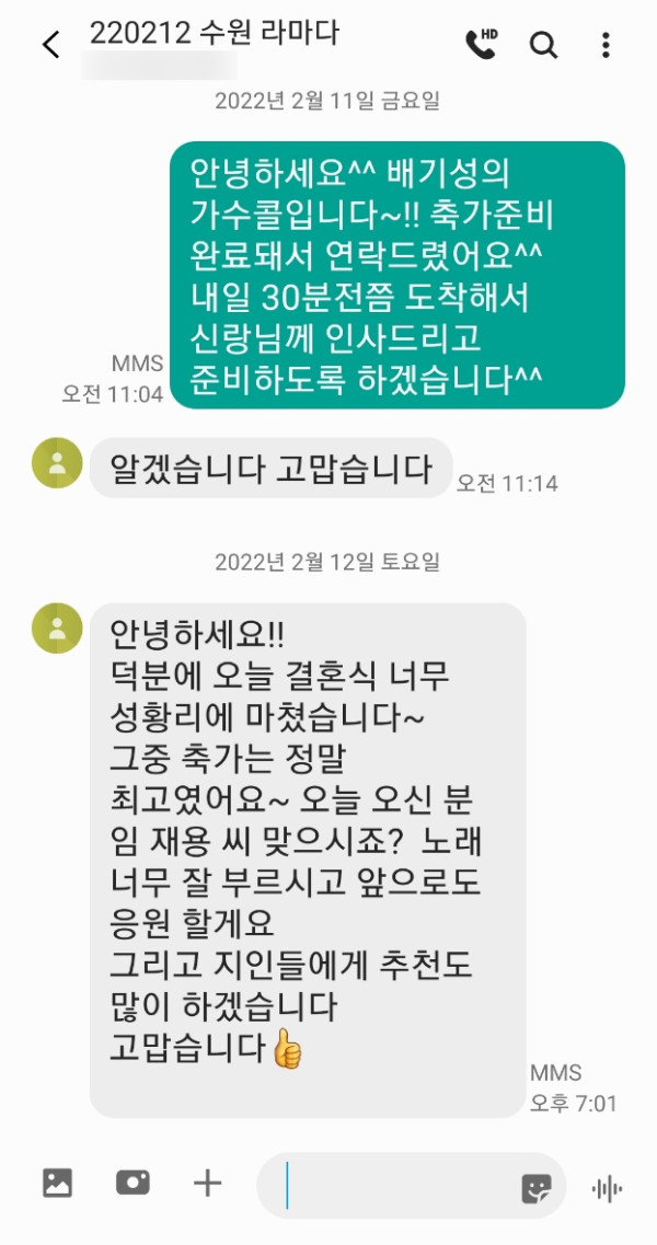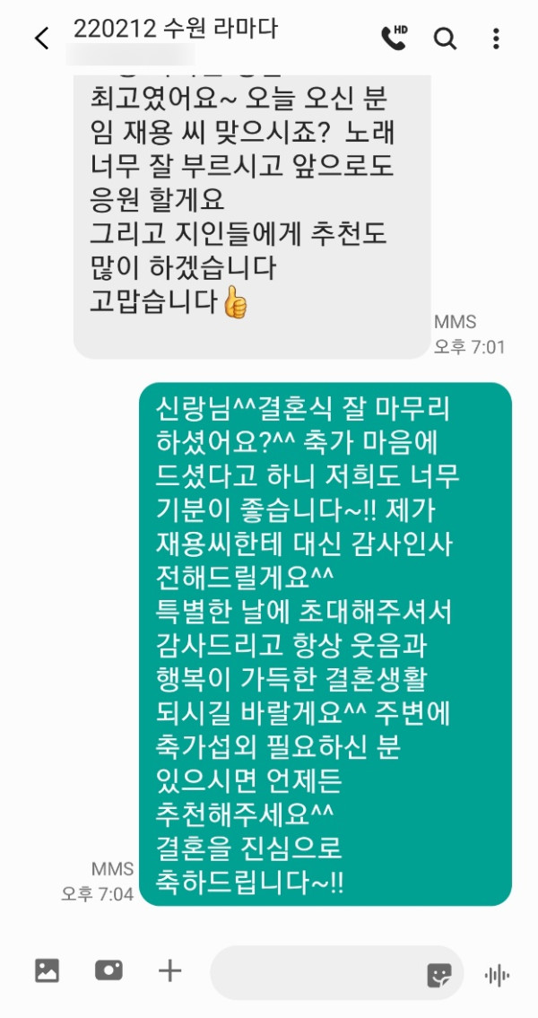 신랑님께서 축가 너무 좋았다고 주변 지인분들에게도