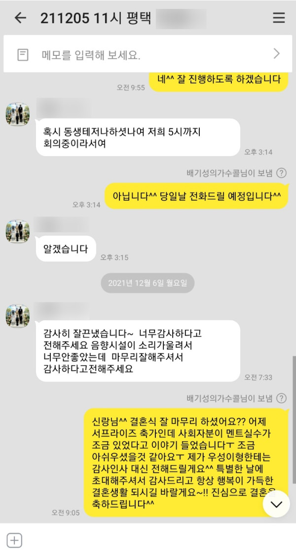 웨딩홀 음향이 고르지 못했는데 열심히 축가불러주셔서 감사하다고