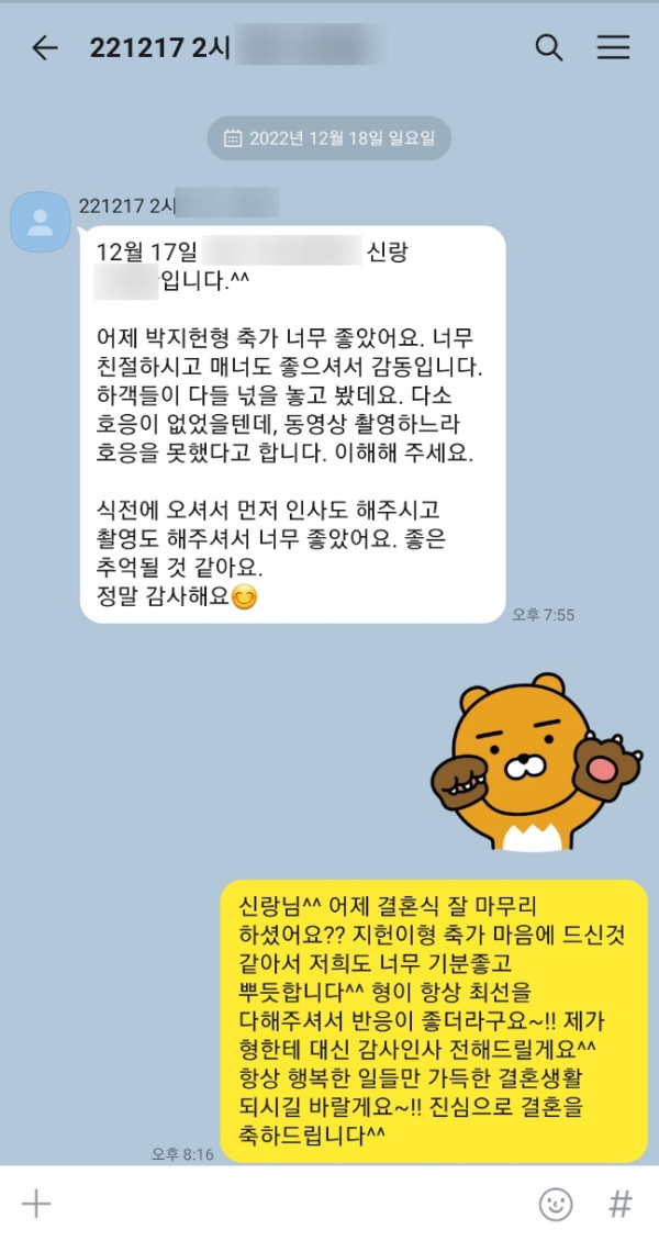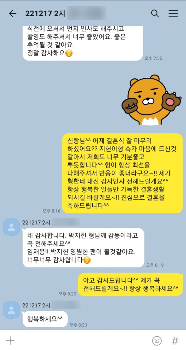 신랑님께서 지헌이형 매너도 너무 좋으시고 노래도 잘 부르시고 너무 좋았다고 이렇게 감사하다고