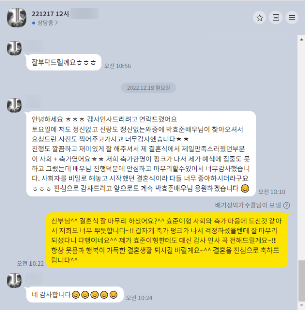 효준이형 사회와 축가 마음에 드신것 같아서 저희도 너무 기분이 좋고 뿌듯하네요~!!