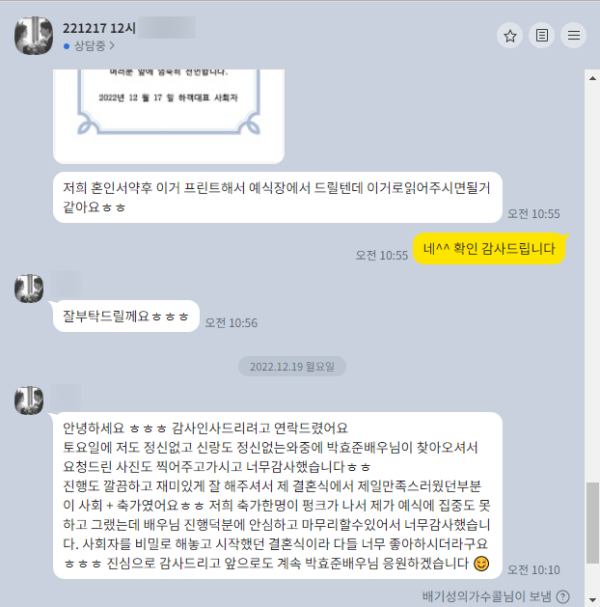 하객들 반응도 너무 좋았고 행복하게 결혼식 잘 마무리 할 수 있었다고 이렇게 연락을 주셨어요^^