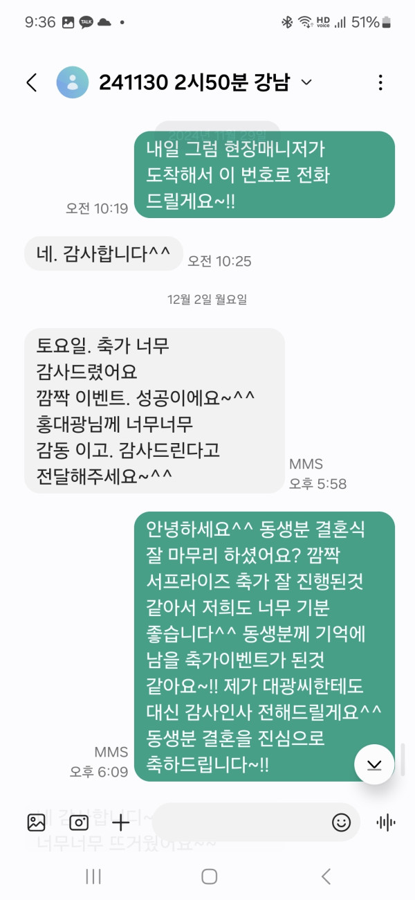 서프라이즈로 잘 진행돼서 너무 다행이고 신부님에게 최고의 결혼선물이 되셨길 바랄게요~!!