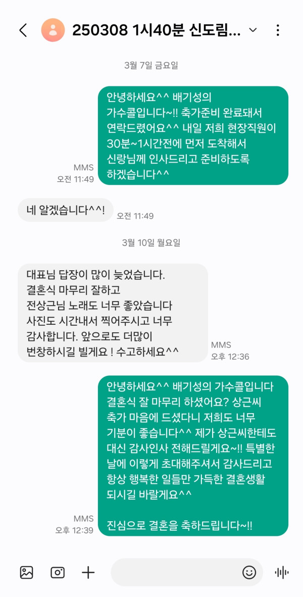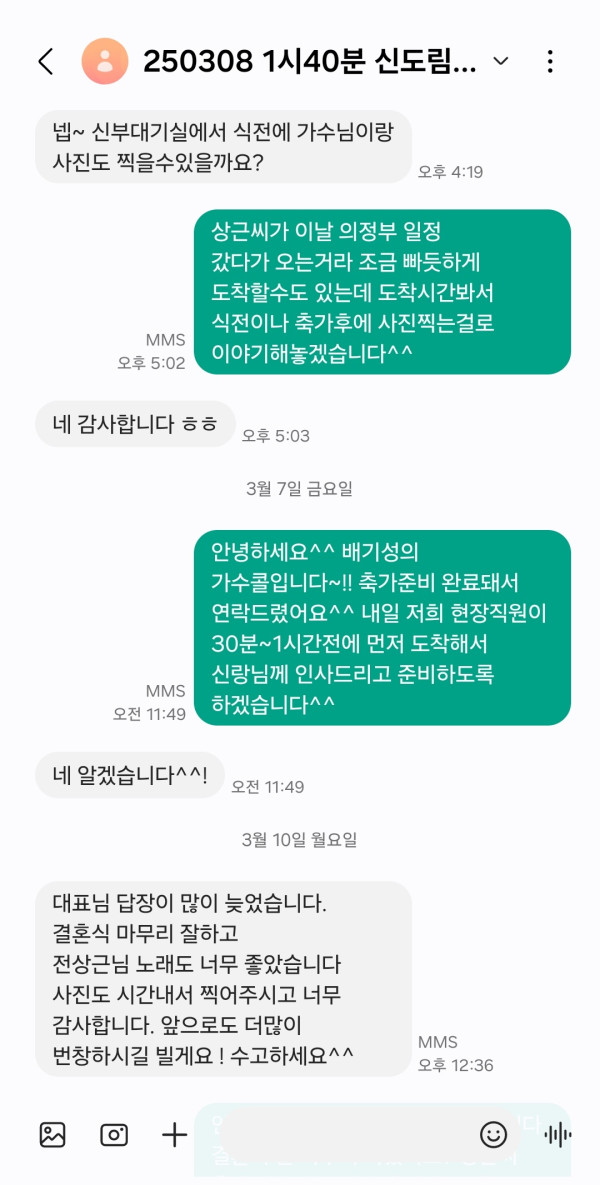 신랑신부님께서 사진촬영도 해주시고 너무 좋았다고 이렇게 감사의 연락을 주셨는데요