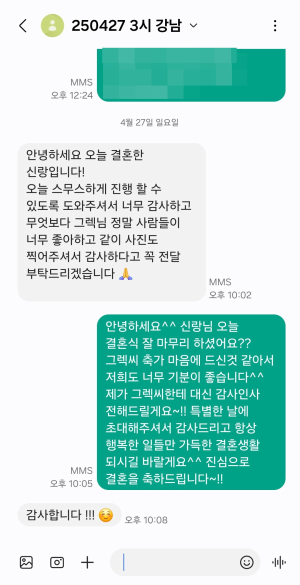 신랑님께서 반응도 너무 좋고 사진도 잘 찍어주셔서 너무 좋았다고 감사하다고 이렇게 연락을 주셨어요~!!