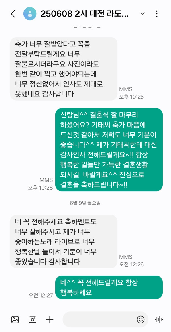 신랑님께서 노래 너무 잘 부르신다고 너무 감사하다고 이렇게 감사인사를 전해주셔서