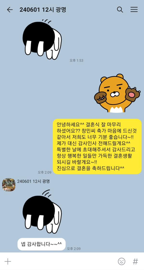 신청자님께서 축가 너무 좋으셨다고 이렇게 연락을 주셨어요~!!