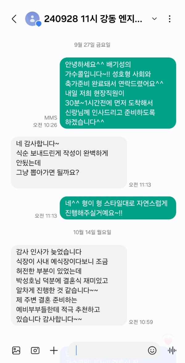 신랑님께서 결혼식사회 진행 너무 잘해주셨다고 이렇게 감사 연락을 주셨어요~!!