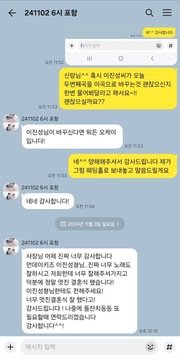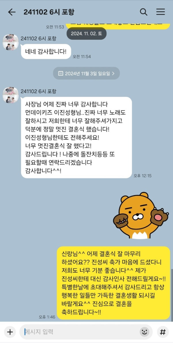 지난 11월 2일 포항 더누벨웨딩홀에서 진행된 먼데이키즈 이진성 결혼식축가 후기입니다^^