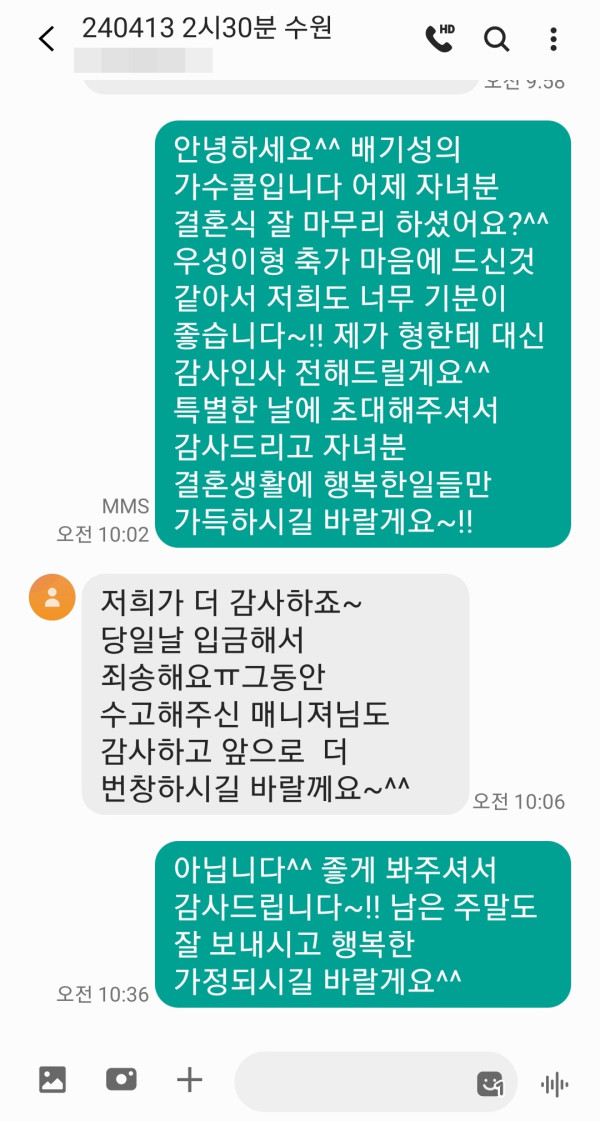 신부어머님께서 신청을 해주셨는데요^^ 너무 좋았다고 감사하다고 연락을 주셨어요~!!
