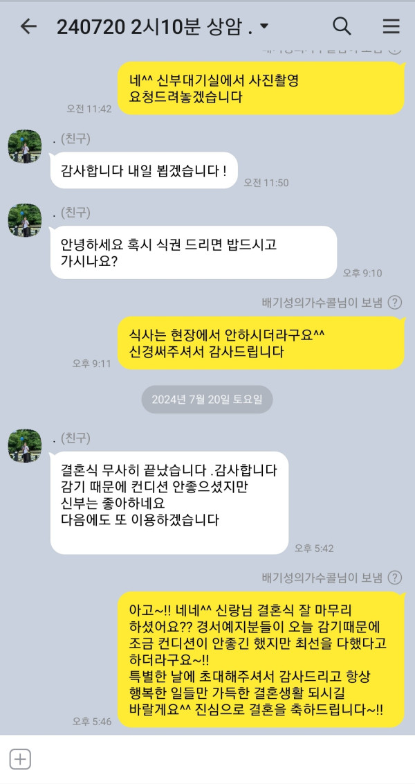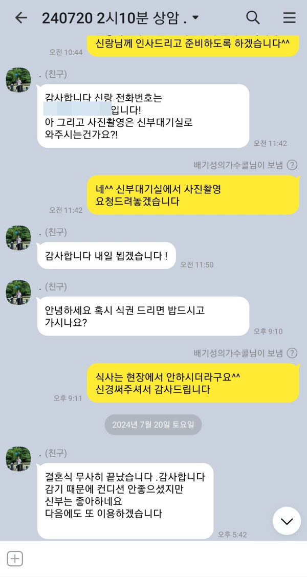 이렇게 연락을 주셨어요^^ 신랑신부님 결혼식을 위해 최선을 다하셨다고 하더라구요