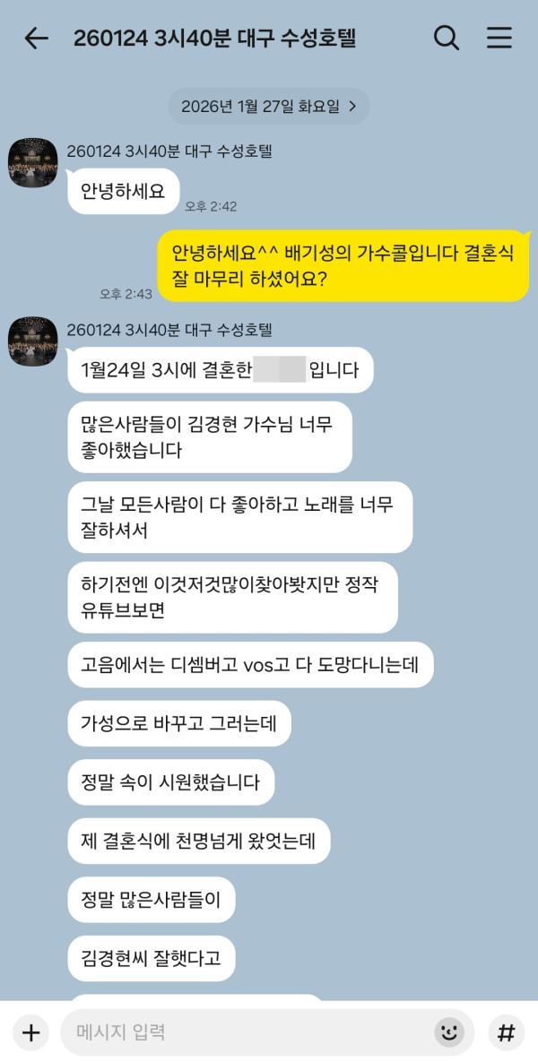 지난 1월 24일 대구 수성호텔에서 진행된 가수 더크로스 김경현 결혼식축가 후기입니다^^